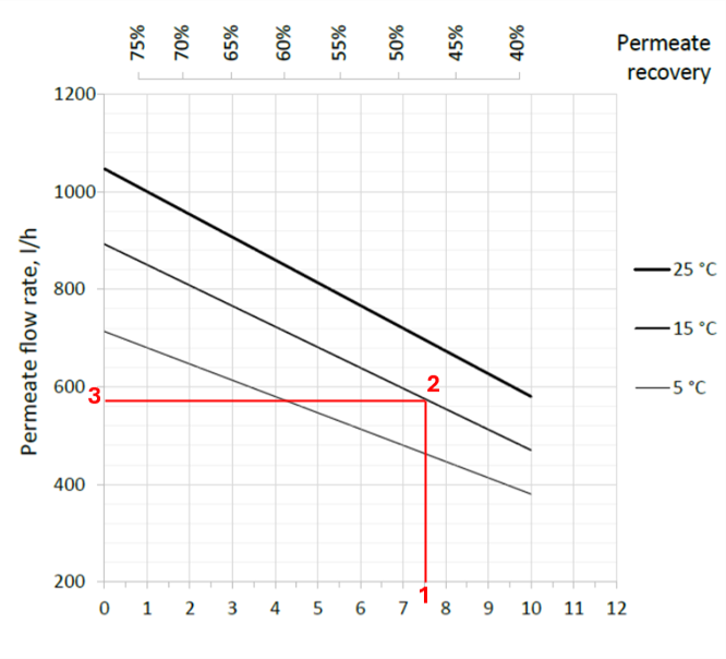 To calculate the permeate flow rate at 15 °C and feed water TDS of 7,500 mg/L, refer to the chart below: