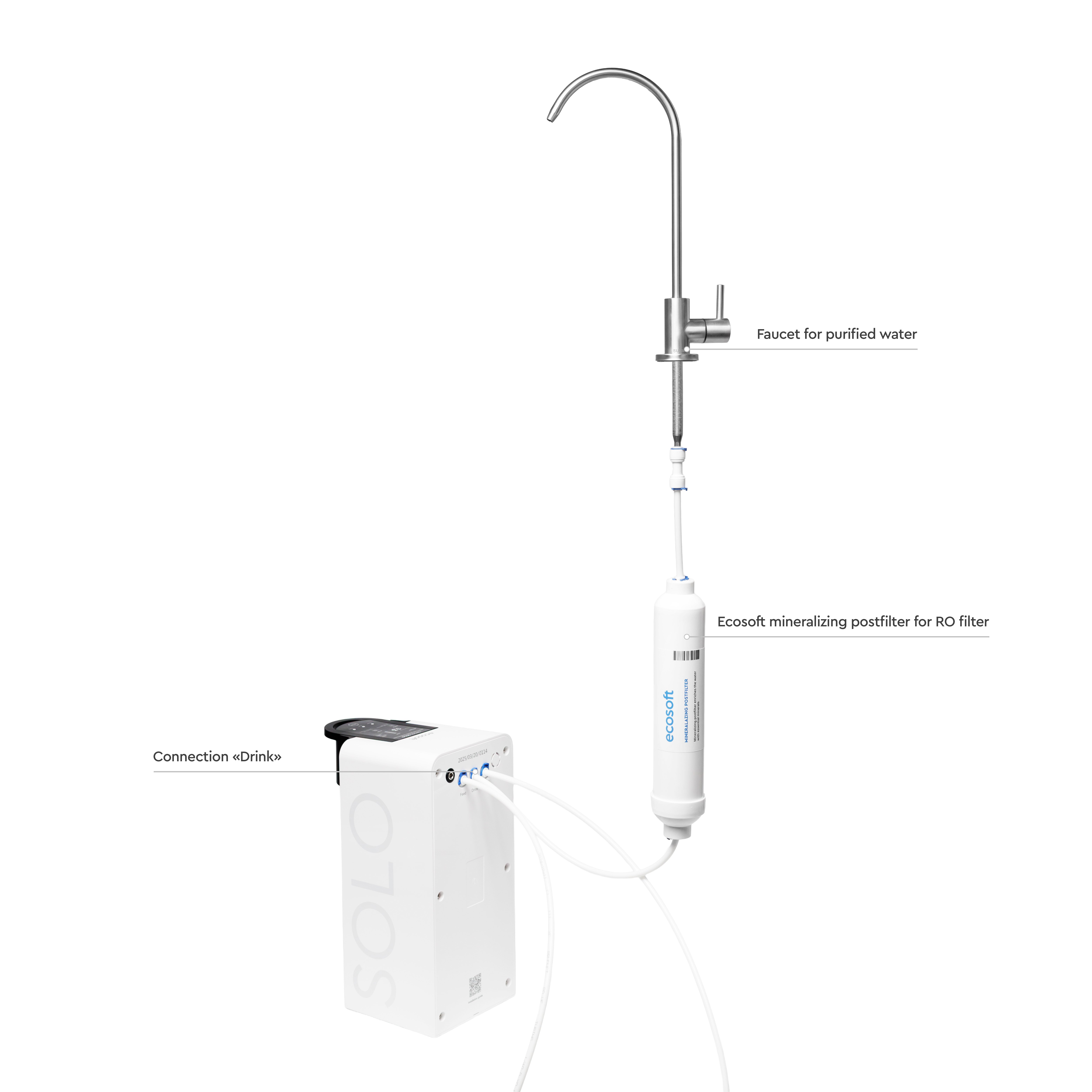 Connect the postfilter between the “Drink” outlet of your reverse osmosis system and the purified water faucet, as shown in the diagram.