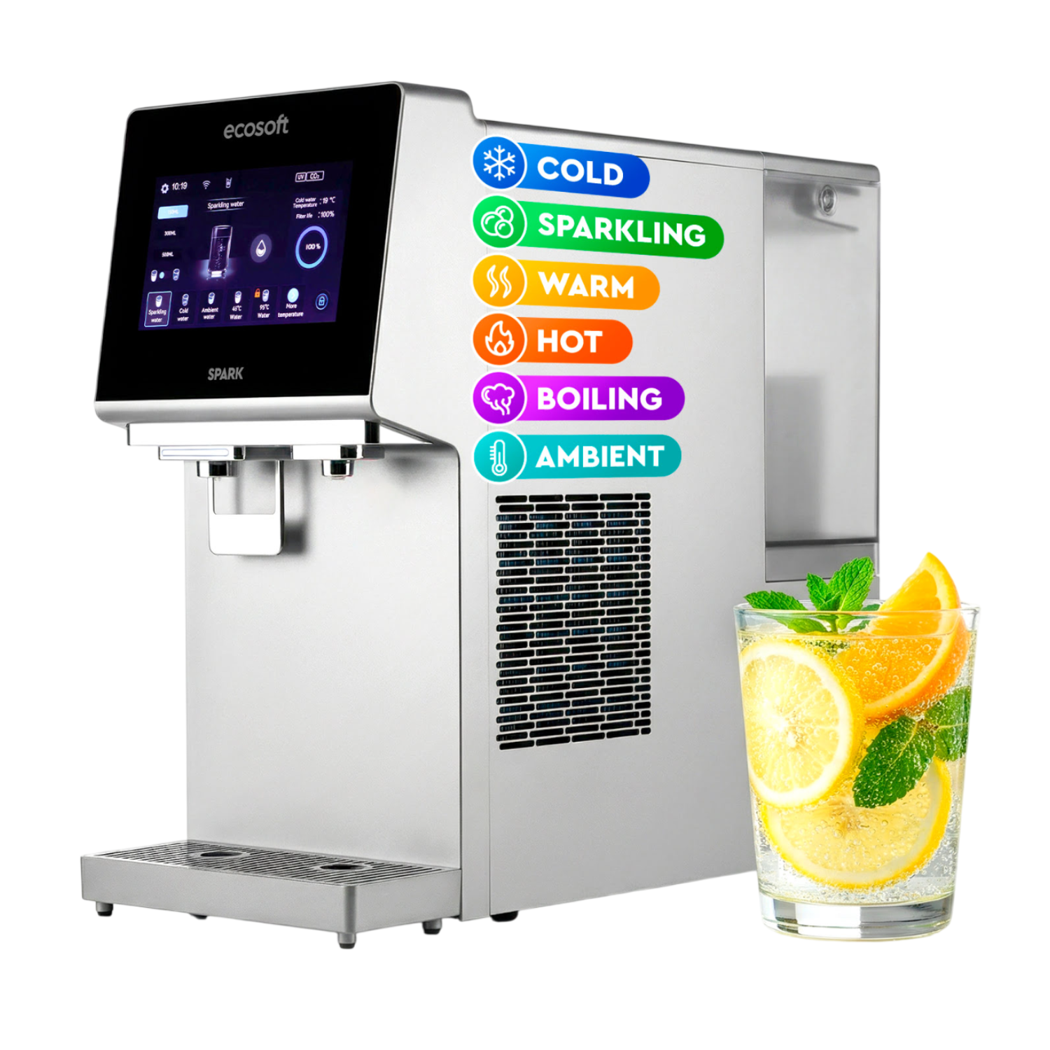 Ecosoft SPARK smart countertop reverse osmosis dispenser is a compact all-in-one system that delivers pure, great-tasting water in multiple formats: cold, warm, hot, boiling, and chilled sparkling. Its 4-stage reverse osmosis filtration removes up to 99% of impurities, ensuring high water quality for everyday use at home or in small offices. The full-color touchscreen provides easy control of temperature and dispensing volume, while real-time TDS and filter status monitoring help you track water quality.
